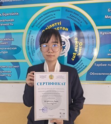 под руководством педагога Тасмаганбетовой Алмагуль Калымтаевны приняла участие в Республиканском конкурсе исследовательских работ «Зерде» (районнный этап) и заняла почетное І место.